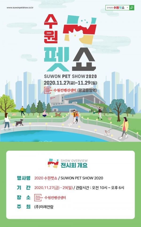 박람회 전문기업 (주)미래전람이 주최하는 이번 수원펫쇼는 사료·간식·의류 등 반려동물 관련 용품을 한자리에서 만나볼 수 있는 행사다. 전자출입명부 운영, 관람객 거리 두기 등 방역수칙을 준수하며 진행된다.