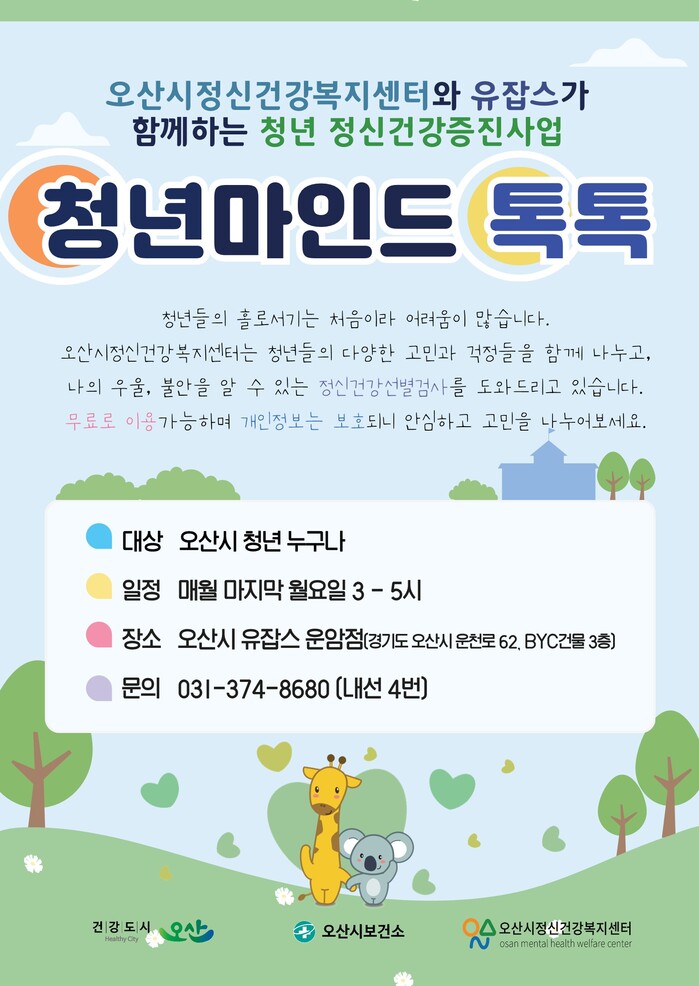 이 사업은 지난 2월에 개소한 오산청년일자리카페 유잡스 운암점(운천로 62, BYC 건물 3층)에서 취업, 대인관계, 자립 등으로 인해 어려움을 겪는 청년들의 다양한 고민과 걱정을 함께 나누고, 마음건강을 점검하여 스트레스나 불안, 우울 등을 예방하는 데 그 목적을 두고 있다.