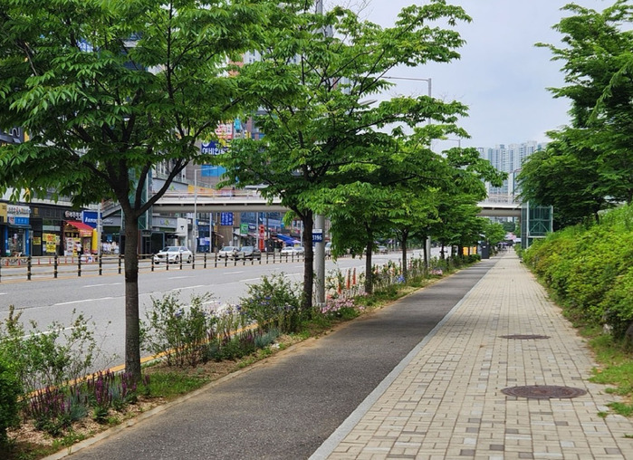 해당 도로는 대규모 아파트 단지와 중심상업지구, 학교 등이 인접해 있어 유동인구가 매우 많은 곳이다. 녹지과는 이 지역의 특성과 시민 이용도를 고려해 계절의 변화를 느낄 수 있는 정원형 띠녹지를 계획했다.