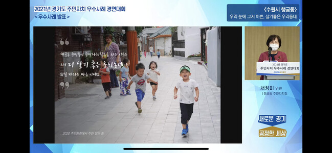 사진/27일 2021년도 경기도 주민자치 우수사례 경연대회에서 서정미 수원시 행궁동 주민자치위원이 발표하고 있다.(유튜브를 통해 온라인으로 생중계된 장면 캡처)(수원시 제공)