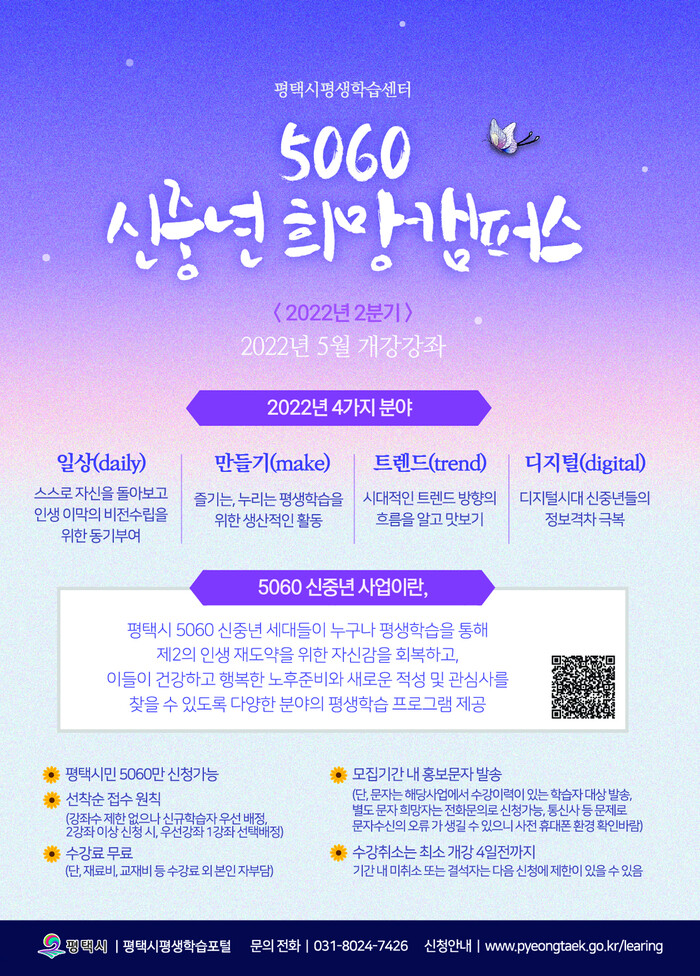 평택시 평생학습센터는 5월부터 개강하는 ‘2022년 5060 신중년 교육 프로그램 수강생 모집’을 실시한다.