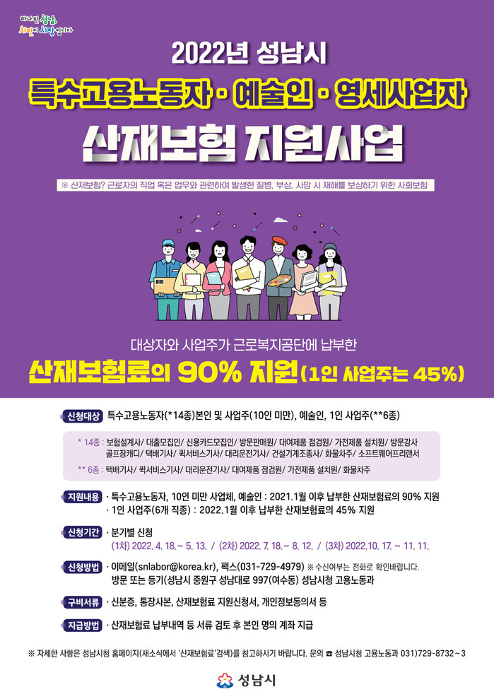 대상자는 산재보험료 지원신청서, 본인 명의 통장 사본 등의 서류를 성남시청 고용노동과 이메일(snlabor@korea.kr)이나 팩스(031-729-4979), 등기우편으로 보내면 된다. 시청 7층 고용노동과 사무실을 방문 접수해도 된다.