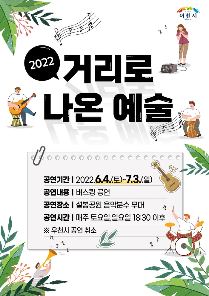 이천시 생활예술인과 전문예술인들이 6월 4일부터 7월 3일까지 주말(매주 토, 일)마다 설봉공원에서 버스킹을 펼칠 예정이다.