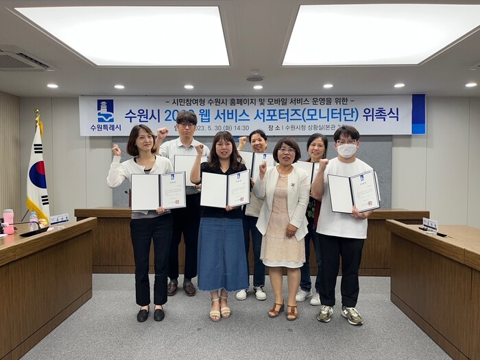 수원시가 5월 30일 상황실에서 ‘수원시 2060 웹서비스 서포터즈(모니터단) 위촉식’을 열고 서포터즈에게 위촉장을 수여했다. 총 19명을 선발했고, 임기는 2년이다.