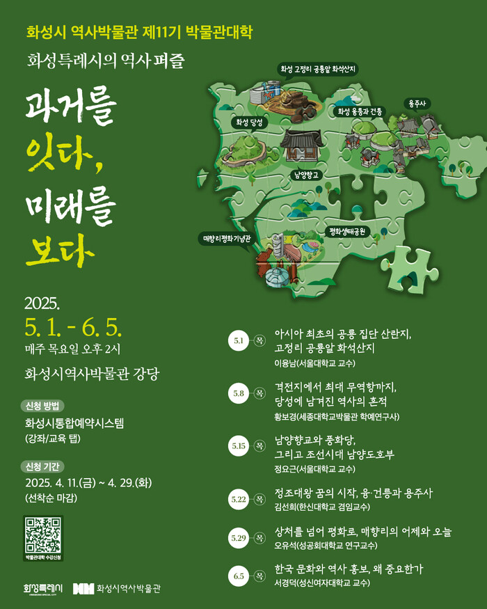 정상훈 문화유산과장은 “이번 박물관대학이 화성특례시의 역사적 가치를 새롭게 조명하고, 시민들이 지역 문화유산을 깊이 이해하는 계기가 되길 바란다”며, “역사와 문화에 관심 있는 많은 분들의 적극적인 참여를 기대한다”고 말했다.