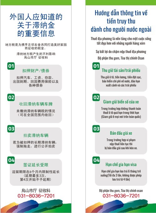 아울러, 외국인이 자주 이용하는 관내 시설 3곳에 영어, 중국어, 베트남어로 작성된 납부 안내 리플렛 및 배너를 설치하고, 외국어 체납 안내문을 발송해 자진 납부를 유도하기로 했다.