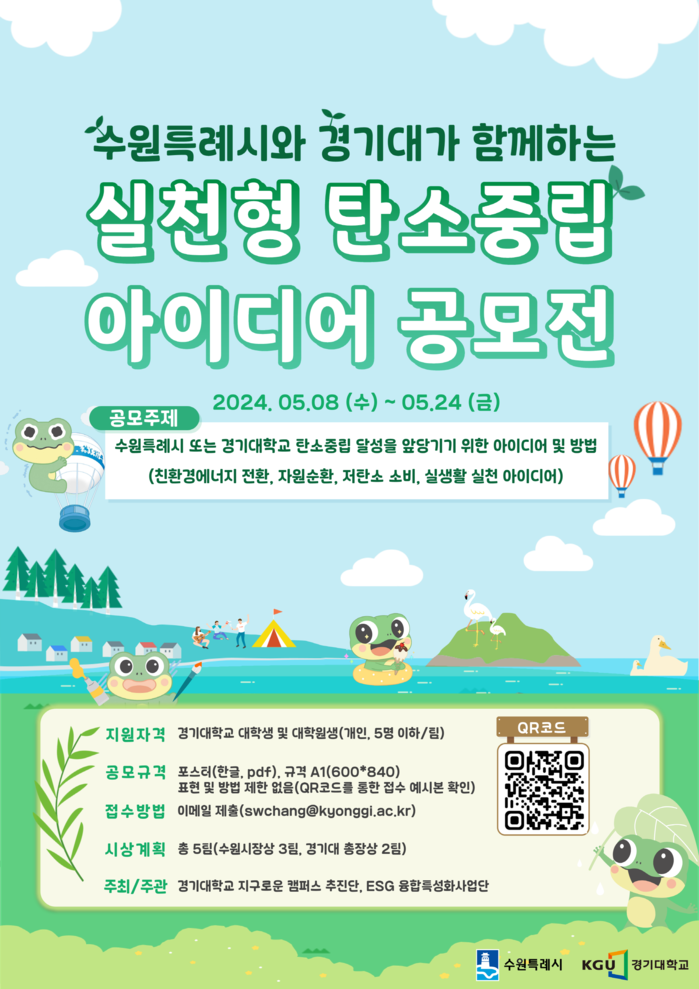 친환경에너지 전환, 자원순환, 저탄소 소비, 주민참여형 실생활 실천 사항과 관련된 아이디어를 응모하면 된다. 수원특례시장상 3명(팀), 경기대 총장상 2명(팀)을 선정해 시상한다.