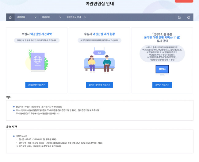 수원시 여권민원실(수원시 팔달구 월드컵로 336)은 수원월드컵경기장 옆에 있다. 수원시 홈페이지(https://www.suwon.go.kr/index.do) ‘여권 민원’ 페이지에서 예약하거나 19시 이전에 방문하면 여유 있게 업무를 볼 수 있다.