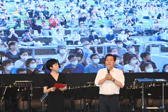 민선 8기 출범과 수원시립교향악단 창단 40주년을 기념해 열린 이날 파크콘서트는 장애인으로 구성된 ‘굿윌 희망합창단’과 ‘청류 국악팀’의 특별공연으로 시작됐다.
