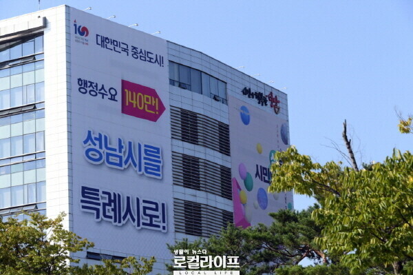 | ▲ 개정된 지방자치법에서 ‘특례시’ 지정 요건이 인구 100만 명 이상으로 설정되며 기준 미달로 특례시가 무산된 성남시는 주민등록상 인구수가 아닌 행정수요로 특례시를 지정해야 한다고 주장하며 반발하고 나섰다. 사진은 성남시청사 벽면에 내걸린 ‘성남특례시’ 염원 펼침막. (사진제공=성남시) |