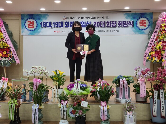 이·취임식은 경기도여성단체협의회 수원시지회 발전에 헌신한 최수아 제18~19대 회장(한국부인회 수원시지회장)에게 공로패·감사패 전달, 소진순 신임회장의 취임사 등으로 진행됐다.
