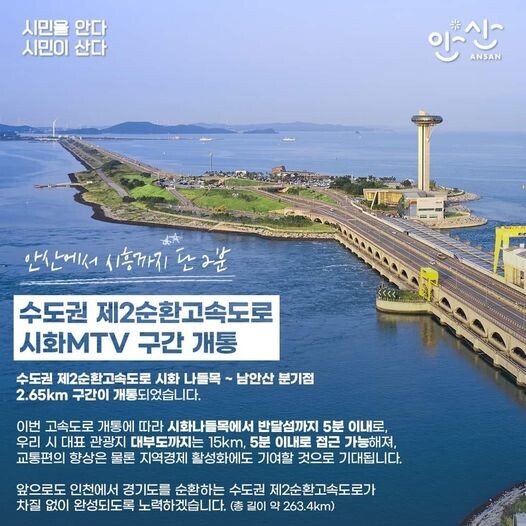 그러면서 이번 고속도로 개통에 따라 시화나들목에서 반달섬까지 5분 이내로 우리 시 대표 관광지 대부도까지는 15km, 5분 이내로 접근 가능해져, 교통편의 향상은 물론 지역경제 활성화에도 기여할 것으로 기대된다고 말했다.