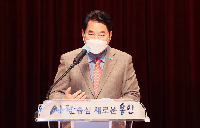 사진/백군기 용인시장이 24일 2021년 용인시 환경보전 유공자 표창장 수여식에서 축사를 하고 있다.(사진제공=용인시)