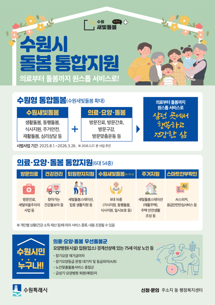 수원시(시장 이재준)가 의료·요양·돌봄 등 복합적인 지원이 필요한 65세 이상 노인을 대상으로 8월 1일부터 의료·요양·돌봄 통합지원 시범사업 서비스를 본격적으로 개시한다.