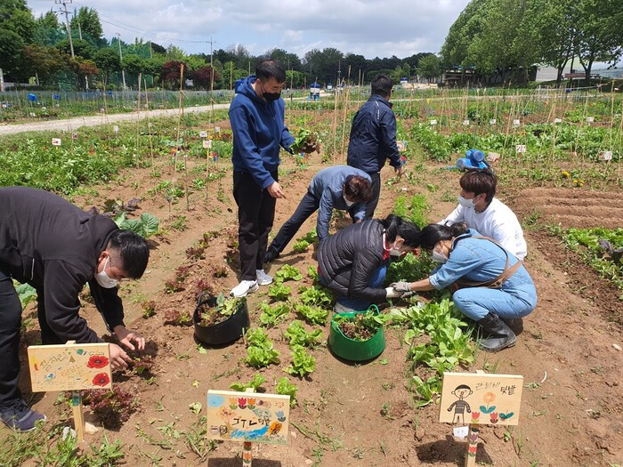 사진/ 탑동 시민농장 교육텃밭에서 ‘치유농업 프로그램’을 진행하는 모습.(수원시 제공)