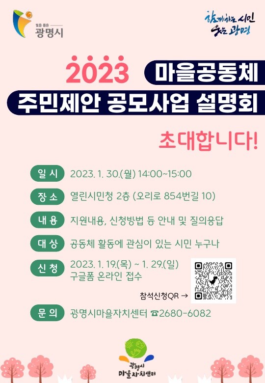 광명시(시장 박승원)는 2023년 마을공동체 활동에 관심이 있는 시민들을 대상으로 오는 30일 열린시민청 2층에서 ‘2023년 마을공동체 주민제안 공모사업 설명회’를 개최한다.