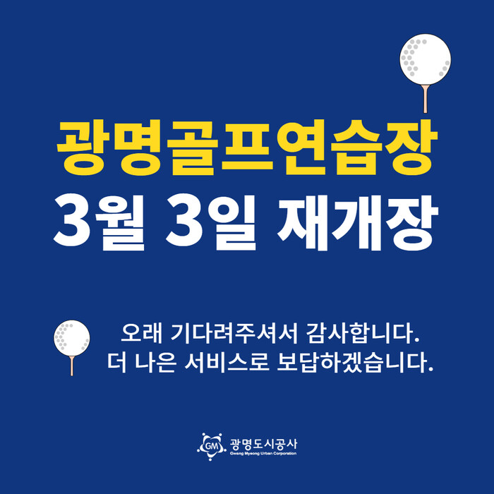 광명도시공사(사장 서일동)는 약 3개월간의 개보수공사를 마치고 오는 3월 3일 광명골프연습장을 재개장 한다고 밝혔다.