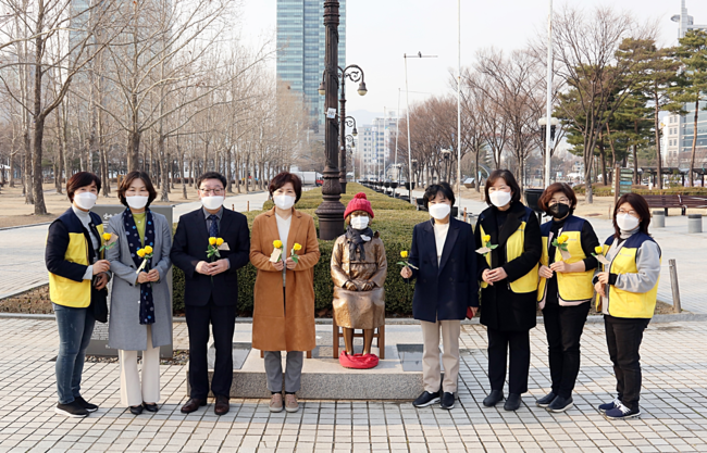 세계 여성의 날인 3월 8일 안양시의회 최병일 부의장, 이호건 더불어민주당 대표의원, 이은희 의원, 윤경숙 의원은 안양여성의전화(대표 이선희) 등 여성단체 관계자들과 안양 평촌 중앙공원에 위치한 ‘안양 평화의 소녀상’을 찾아 램지어 교수를 규탄하고 위안부 망언 논문의 철회를 촉구했다.