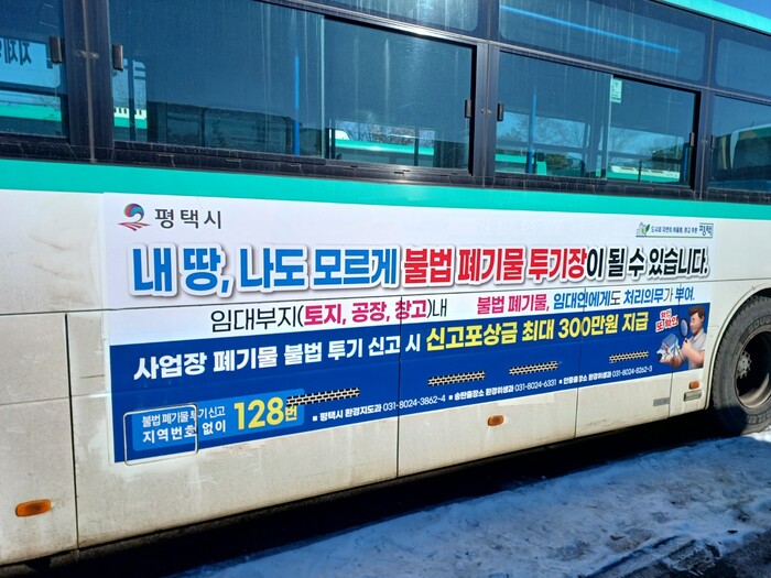 이에 평택시는 건물·토지주에게 막대한 재산피해를 보게하는 등 사회적 문제를 일으키는 불법 폐기물 투기·방치행위 근절과 예방을 위한 홍보를 내년 3월말까지 다양한 방법(시내 및 외곽노선 버스광고, 버스정보시스템(BIS) 활용, 행정게시대 홍보현수막 설치, 관련부서 및 공인중개사 등에 홍보 포스터 배부 등)을 통해 적극적으로 시민들에게 홍보하겠다고 밝혔다.