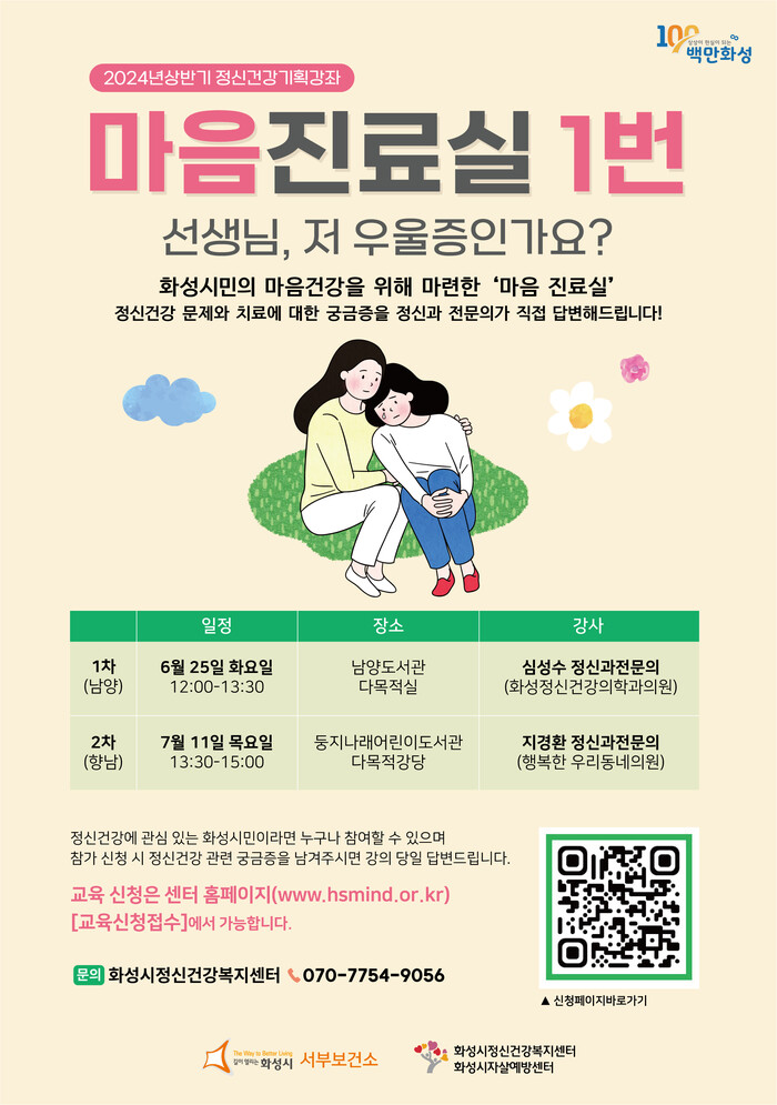1차는 이달 25일 남양도서관 다목적실에서 심성수 화성정신건강의학과의원 정신과전문의가, 2차는 다음 달 11일 향남읍 소재 둥지나래어린이도서관 다목적강당에서 지경환 행복한 우리동네의원 정신과전문의가 강사를 맡아 진행한다.