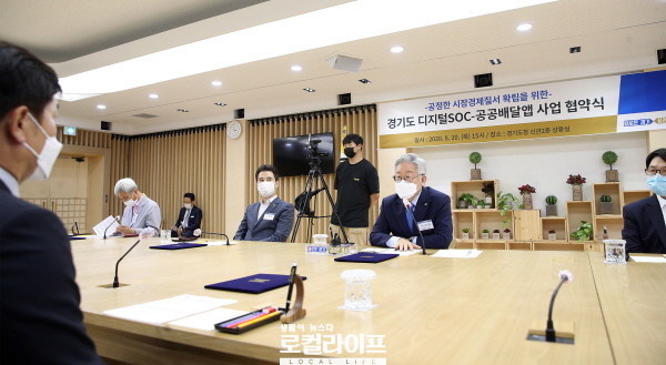 | ▲ 11월 초 시범사업 시행을 앞둔 경기도 공공배달앱 ‘배달특급’이 사전접수 6주만에 목표치의 120%를 달성하며 순항을 예고하고 있다. 사진은 지난 8월 20일 오후 경기도청 상황실에서 열린 ‘경기도 디지털 SOC-공공배달앱 사업 업무 협약식’ 모습. (사진제공=경기도) |
