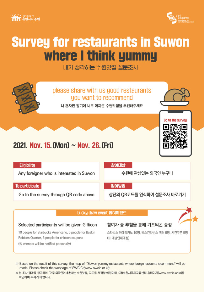수원시에 관심 있는 외국인은 누구나 웹 포스터의 큐알(QR)코드를 스캔해 설문에 참여할 수 있다. 선호하는 음식점의 상호와 위치, 추천 이유를 적으면 된다. 설문 참여자 중 20명을 추첨해 치킨(5명)·아이스크림(5명)·커피(10명) 모바일상품권을 선물한다.
