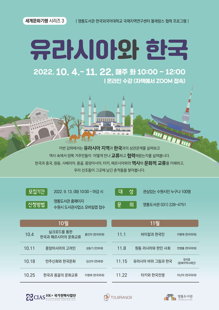 수원시 영통도서관이 한국외대와 협력해 마련한 ‘세계문화기행’의 3번째 강좌인 ‘유라시아와 한국’에 참가할 시민 100명을 9월 13일 오전 10시부터 선착순 모집한다.