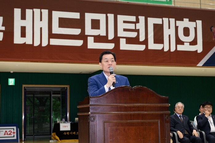 이재준 수원시장이 14일 수원시배드민턴전용경기장에서 열린 ‘제12회 OBS 전국 배드민턴대회’ 개회식에 참석했다.