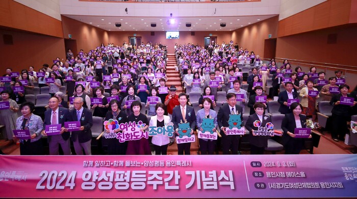 시는 양성평등주간(9월 1일~7일)을 기념해 매년 양성평등에 대한 의미를 알리고 공감대를 형성하기 위한 기념식을 여는데, 올해 주제는 ‘함께 일하고, 함께 돌보는 양성평등한 용인특례시’로 정했다.