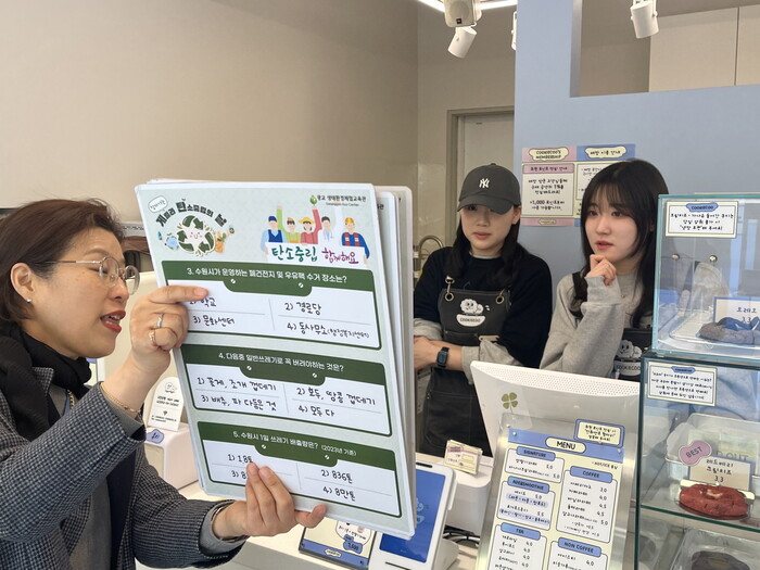사진/광교 생태환경체험교육관 관계자가 소상공인을 찾아가 탄소중립 교육을 하고 있다.(사진제공=수원시)