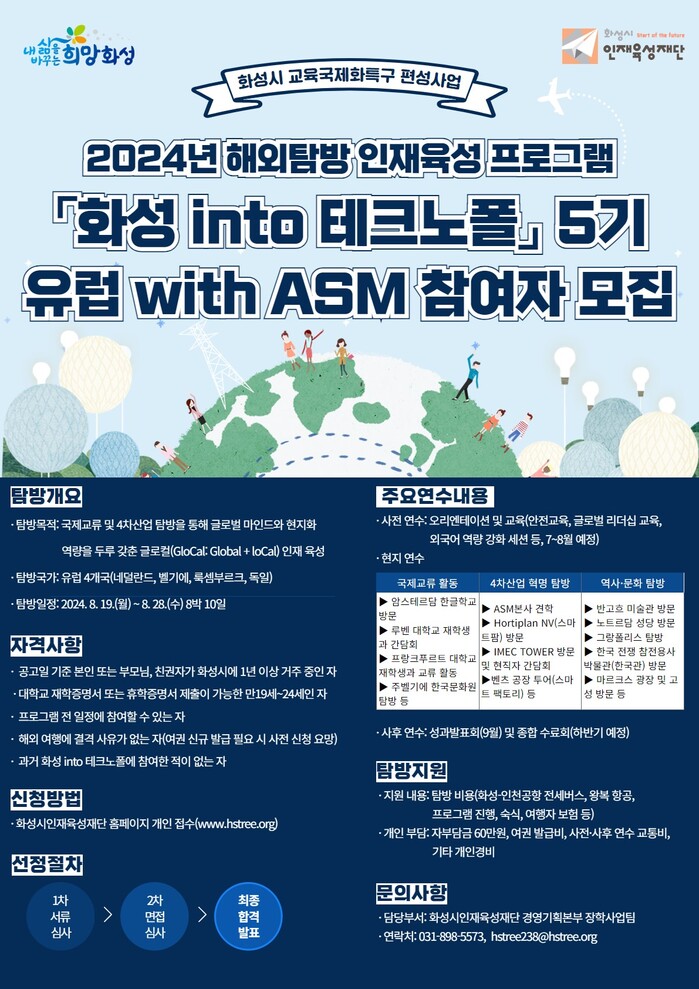 화성시인재육성재단(대표이사 임선일)이 글로벌 인재 육성 프로그램인‘화성 into 테크노폴' 5기 유럽 with ASM 탐방단을 모집한다.
