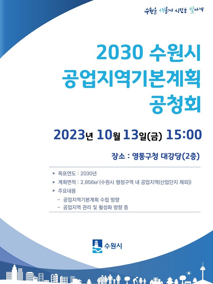 수원시는 10월 13일 오후 3시 영통구청 대강당에서 ‘2030년 수원시 공업지역기본계획(안) 공청회’를 개최한다.