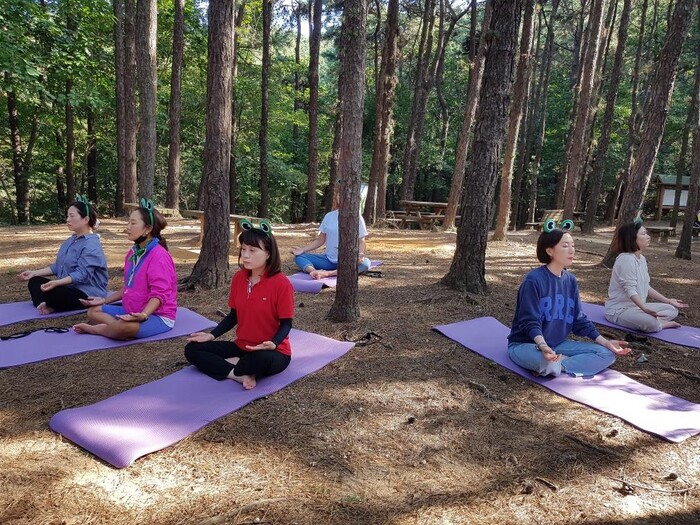 사진/상담사들이 숲속 명상 체험을 하고 있다.(사진제공=수원시)