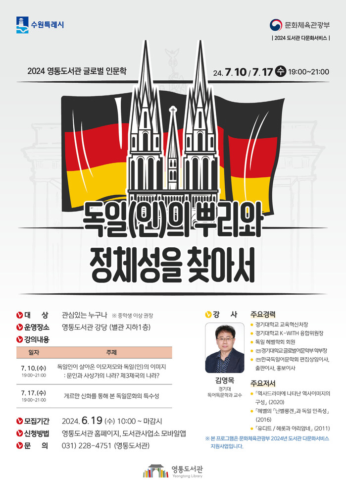 수원 영통도서관이 2024 글로벌 인문학 강의(1·2회차)인 ‘독일(인)의 뿌리와 정체성을 찾아서’의 수강생을 모집한다.