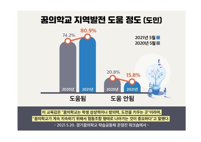 특히 도민 10명 가운데 8명은 경기꿈의학교가 학교 밖 교육활동으로 지역 교육에 도움이 된다(80.9%)고 답하며 잘한 정책(80.2%)이라고 평가했다.
