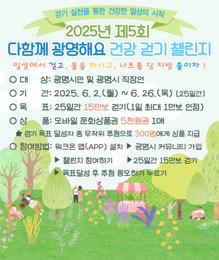 광명시(시장 박승원)는 시민들의 건강한 생활 습관 형성과 만성질환 예방을 위해 오는 2일부터 26일까지 ‘2025년 제5회 다함께 광명해요 건강 걷기 챌린지’를 운영한다.
