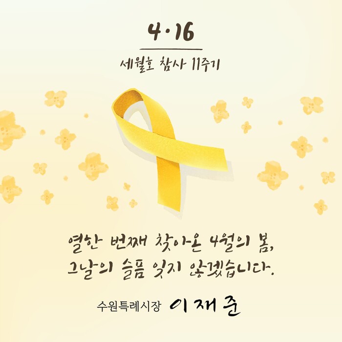 [수원=로컬라이프] 박봉민 기자 = '세월호 참사 11주기'를 맞아 이재준 수원특례시장은 "잊지 않겠다"며 "시민의 생명을 지키고 안전한 나라를 만들기 위한 엄중한 책임을 가슴에 깊이 새기겠다"고 다짐했다.