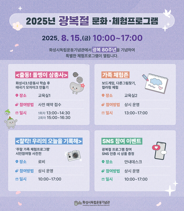 화성특례시(시장 정명근)가 오는 15일 광복 80주년을 맞아 화성시독립운동기념관에서 ‘2025년 광복 80주년 문화·체험프로그램’을 운영한다.