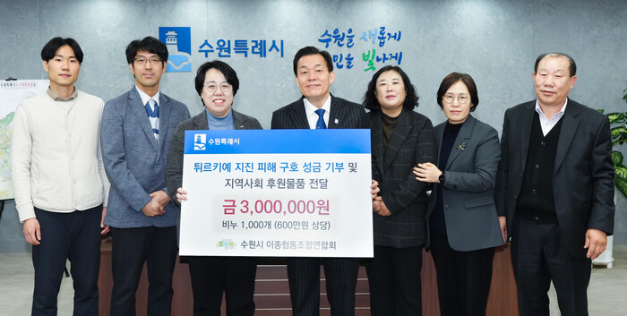 수원시이종협동조합연합회가 “튀르키예 지진피해 복구 지원에 사용해 달라”며 수원시에 300만 원을 기부했다. 또 “수원시 취약계층 시민에게 전달해 달라”며 회원사가 제작한 비누 1000개를 후원했다.