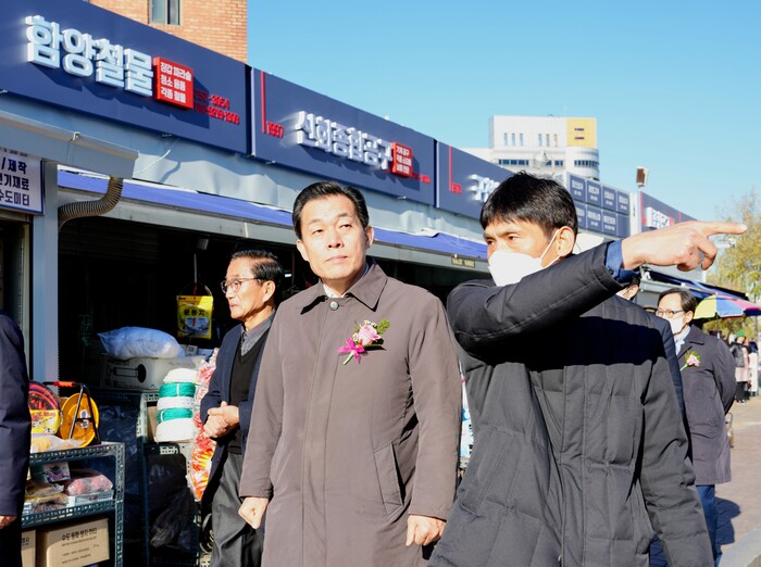 사진/이재준 수원시장이 간판을 교체한 구천동공구시장을 둘러보고 있다.(사진제공=수원시)