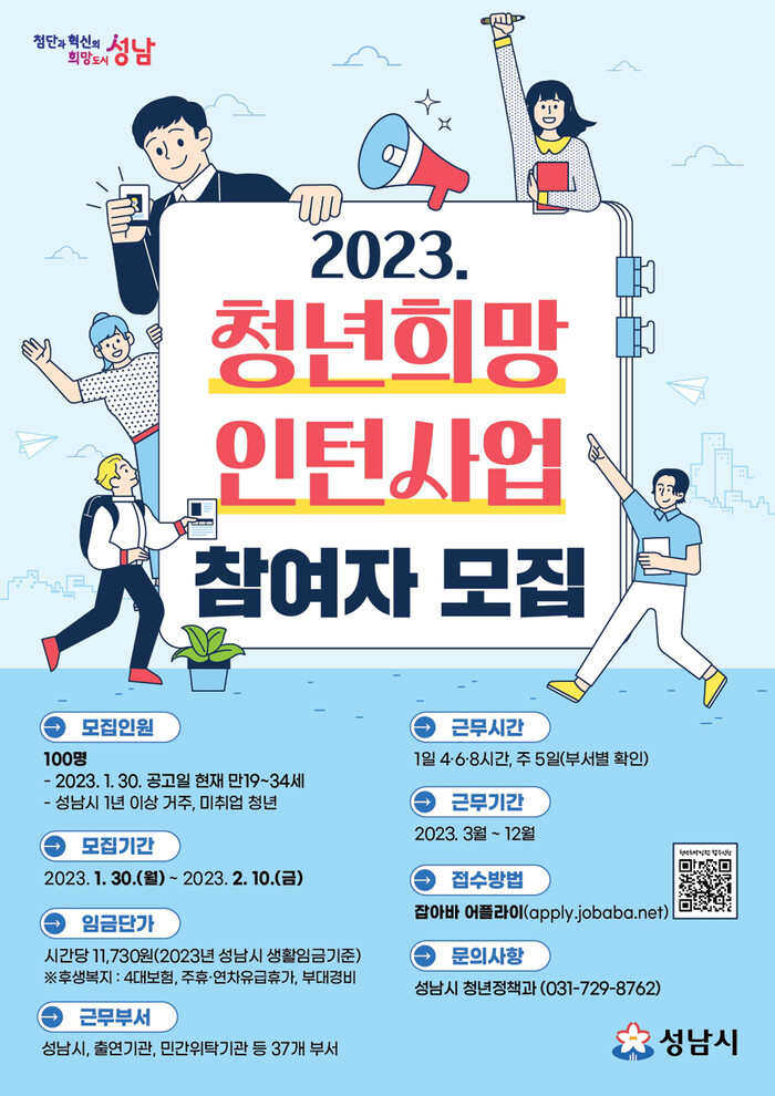 성남시는 오는 1월 30일부터 2월 10일까지 ‘청년 희망 인턴 사업’ 참여자 100명을 모집한다.