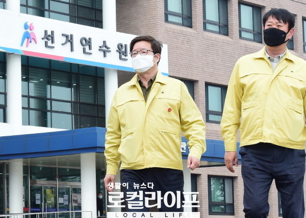수원시는 해외 입국자를 통한 코로나19’ 확산 방지를 위해 안심숙소를 비롯해, ‘안심귀가’, ‘임시생활시설 제공등을 시행하고 있다. 사진은 염태영 수원시장(왼쪽)이 수원시 임시생활시설인 중앙선거관리위원회 선거연수원 생활동을 찾아 점검하는 모습. (사진제공=수원시)