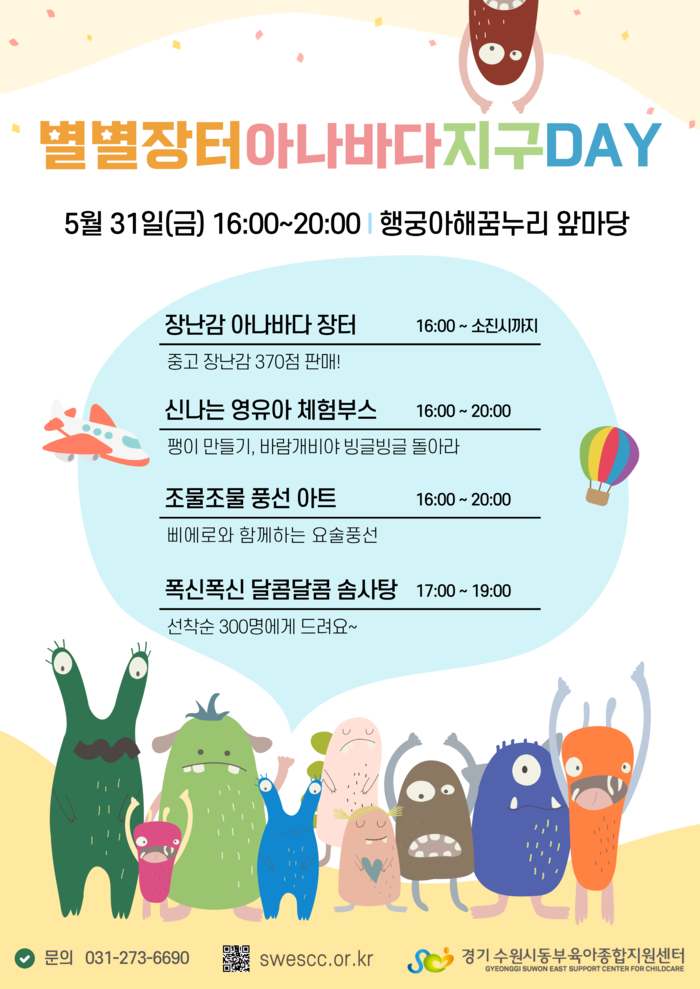 수원시동부육아종합지원센터는 5월 31일 오후 4시~8시 행궁아해꿈누리 앞마당에서 영유아 가정이 함께 참여하는 ‘별별장터 아나바다 지구 DAY’ 행사를 연다.