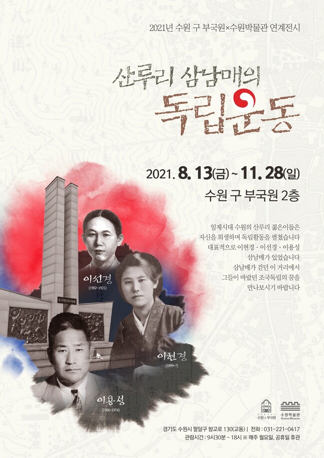 수원 구 부국원이 제76주년 광복절을 맞아 수원 산루리 출신 독립운동가 이현경·선경·용성 삼남매의 삶을 조명하는 전시회 ‘산루리 삼남매의 독립운동’을 개최한다.