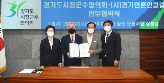 이날 업무협약식에는 곽상욱 경기도시장군수협의회장을 비롯한 신선철 경기언론인클럽 이사장(경기일보 명예회장), 최윤정 중부일보 대표이사, 최선욱 경기신문 대표이사 등 4명이 참석했다.