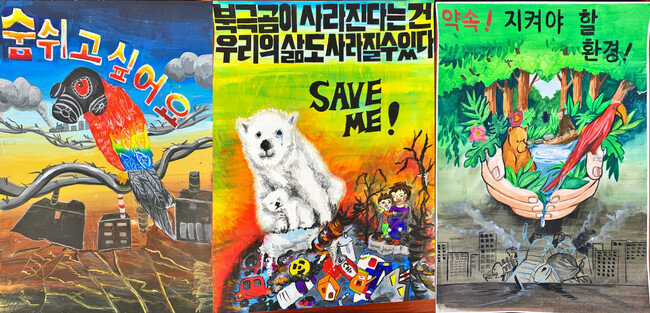 사진/왼쪽부터 ‘숨쉬고 싶어요’, ‘북극곰이 사라진다는 건 우리의 삶도 사라질 수 있다’, ‘약속! 지켜야할 환경!’(사진제공=수원시)