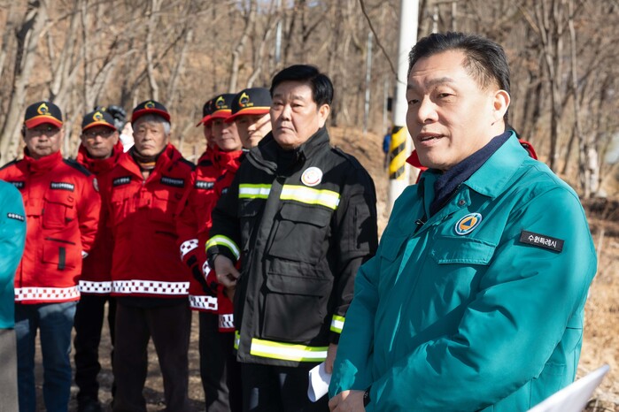 이재준 수원시장이 13일 광교산 기슭에서 ‘새빛 현장시장실’을 열고, 산불 대응 체계를 점검했다.