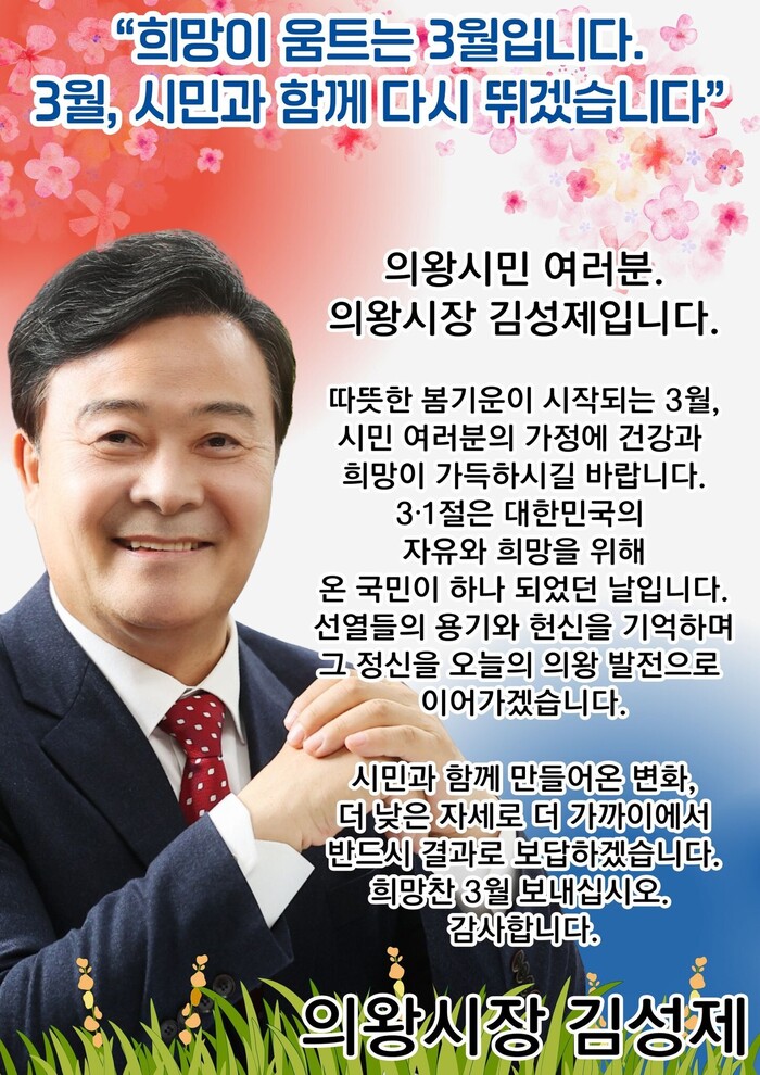 [의왕=로컬라이프] 송준형 기자 = 김성제 의왕시장은 3월 1일, 페이스북을 통해 선열들의 숭고한 뜻을 마음에 새기며 의왕시민 여러분의 일상 속에서 체감할 수 있는 변화를 만들겠다는 다짐으로 3월을 맞이한다고 밝혔다.