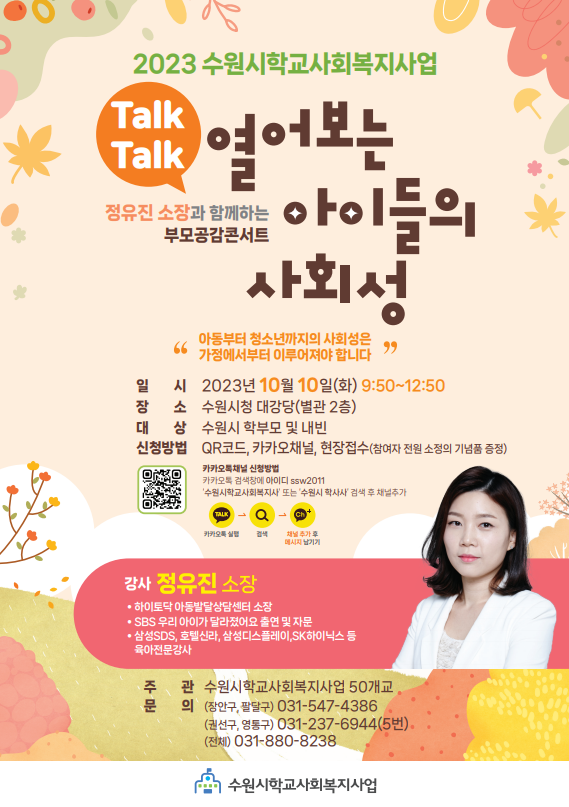 ‘TalkTalk(톡톡) 열어보는 아이들의 사회성’을 주제로 열리는 이날 부모공감콘서트는 학교사회복지사업 50개교가 주관한다. 수원시 학교사회복지사업을 소개하고, 학부모들의 의견을 듣는다. 정유진 하이토닥 아동발달상담센터 소장의 강연으로 이뤄지는 학부모 연수도 있다.