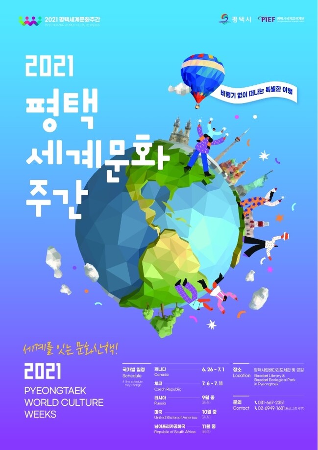 평택시가 주최하고 평택시국제교류재단이 주관하는 2021평택세계문화주간이 오는 26일 캐나다문화주간을 시작으로 국가별 일정에 따라 배다리도서관・배다리생태공원 일대에서 열린다.